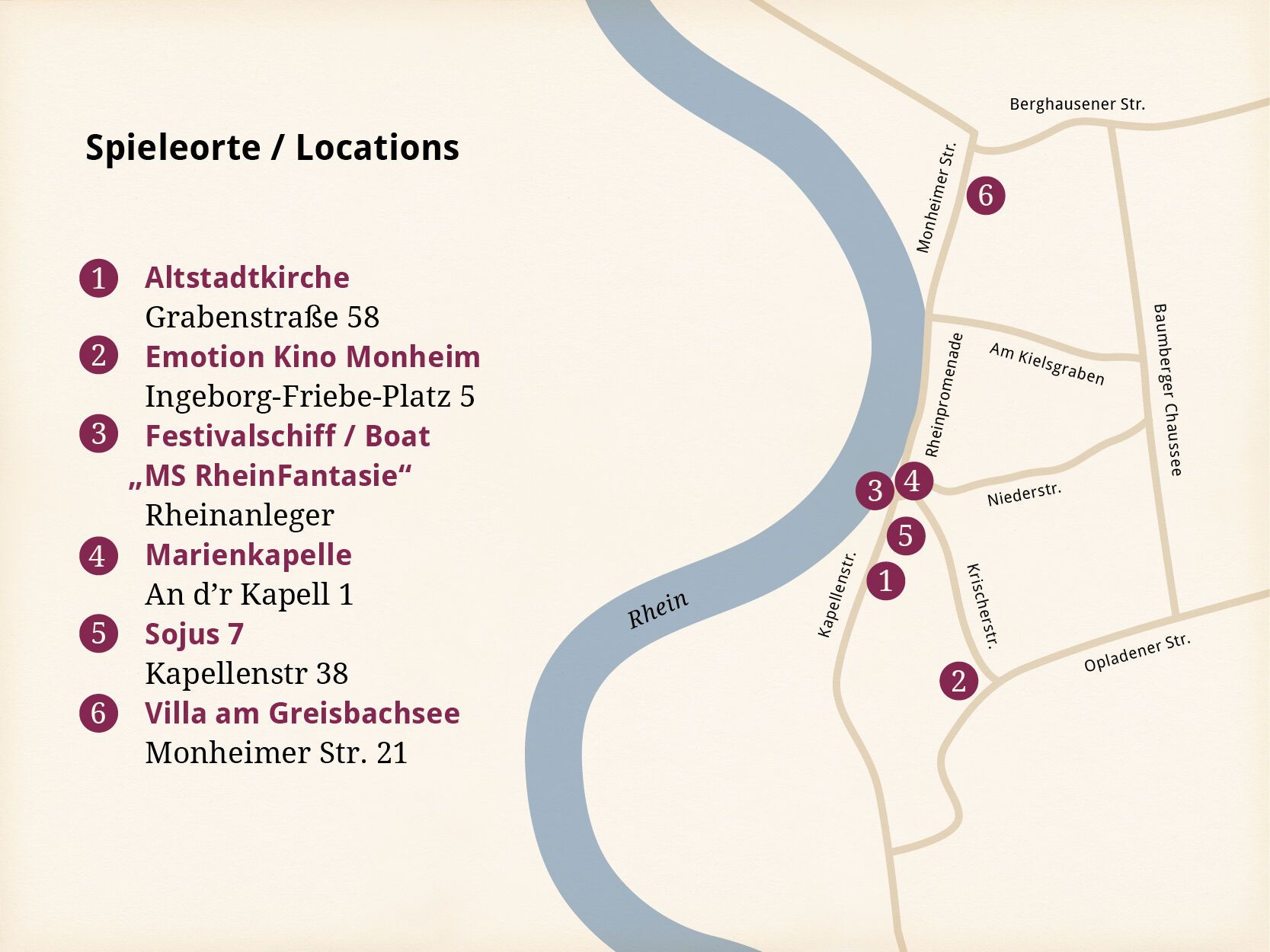 Bei The Festival 2025 war das Festivalschiff „MS Rheinfantasie” Hauptspielstätte. Darüberhinaus fanden Veranstaltungen statt im Kulturzentrum Sojus 7, in der Altstadtkirche Monheim, der Marienkapelle und in der Villa am Greisbachsee. Darüber hinaus wurde während The Festival die Filmdokumentation „Every Note You Play“ von Mika Kaurismäki über The Prequel 2024 im Emotion Kino in Monheim Mitte gezeigt.