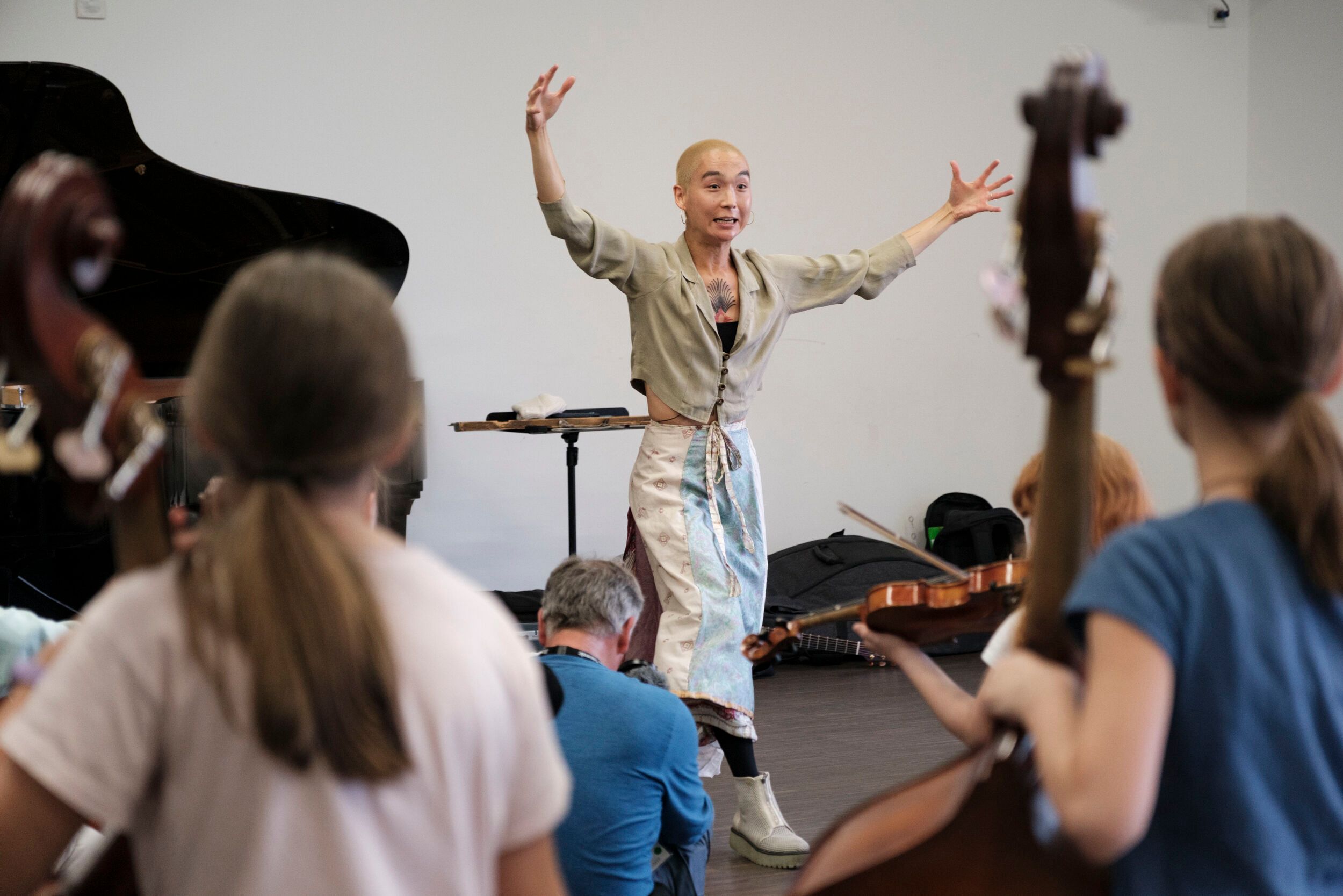 Schon bei der ersten Ausgabe von The Prequel kam es 2021 zu einer Kooperation mit den „Orchesterklassen“ der Musikschule. Und auch die Aufführung der Komposition „dance until you know what it is“ von yuniya edi kwon für The Festival 2025 basierte auf einer langfristigen Zusammenarbeit: In einem Improvisationsworkshop haben yuniya edi kwon und Shahzad Ismaily das Schüler:innen-Ensemble des Otto-Hahn-Gymnasiums schon während The Prequel 2024 kennengelernt. Auf Basis dieser freundlichen Begegnung und in intensivem Austausch zwischen dem Ensemble und den Signature Artists entstand eine Performance aus gleichermaßen komponierten und improvisierten Teile.