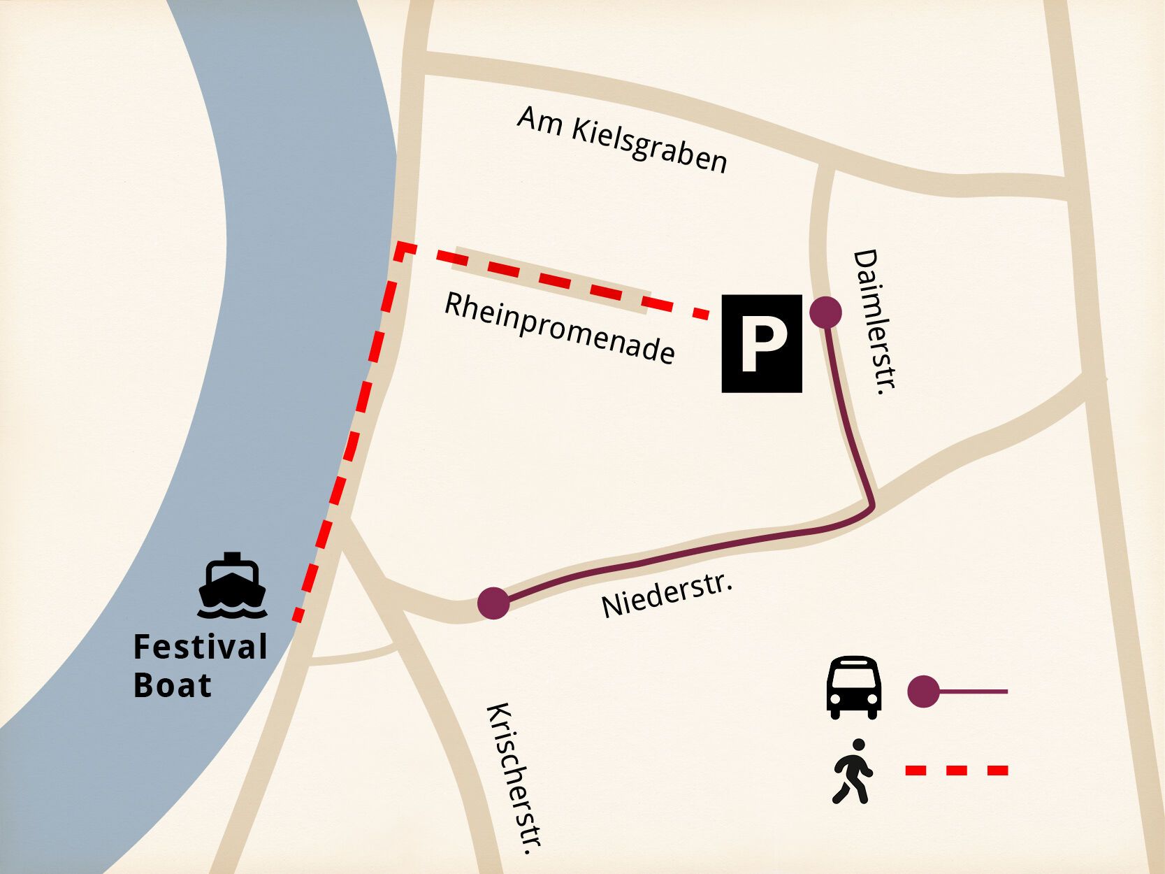 On the second floor of the parking garage there is an exit in the direction of the Rhein promenade. Walk left along the Rhein and after a few minutes you will reach the jetty and the Festival Boat.